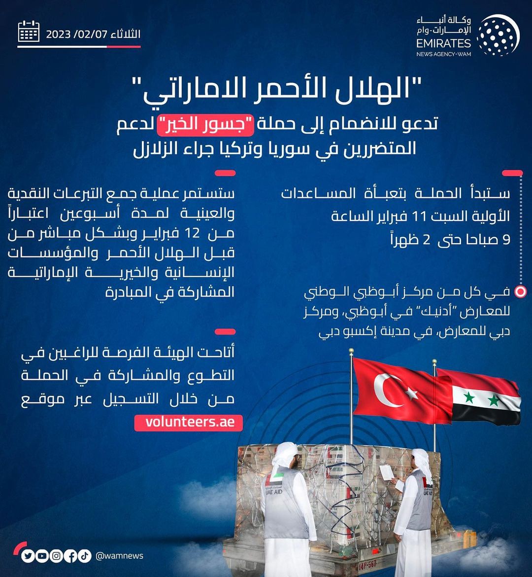 The UAE humanitarian arm and a number of ministries have called for participation in the “Bridges of Good” campaign to assist in gathering and assembling relief supplies for quake-ravaged Türkiye and Syria.